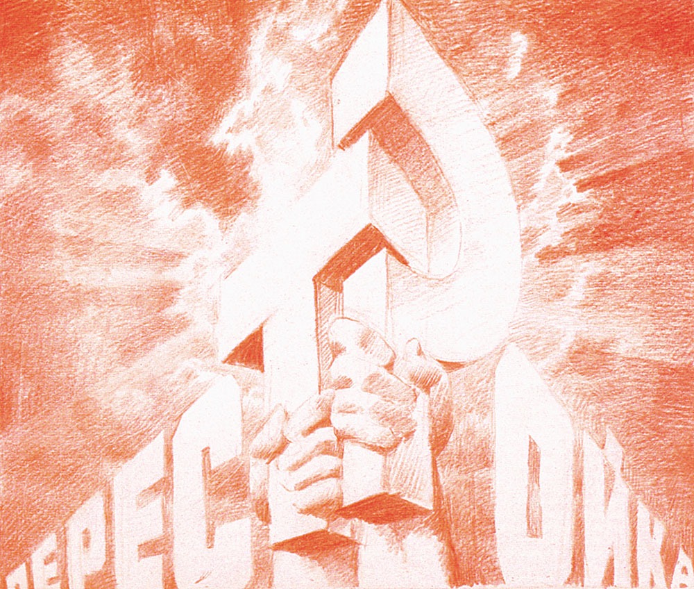С точки зрения букв картина представляет собой весь мир: за ее пределами не может быть ничего. Конструкция из букв прочна, неподвижна — статична. С точки зрения неба — картина всего лишь фрагмент, за пределами которого остается огромное пространство. Здесь все — динамика. Через минуту облака изменятся, а мы видим лишь мгновение бесконечного движения. Таким образом, небо оказывается свободным от власти красных букв. Выясняется, что слова «СЛАВА КПСС» написаны не по небу, а по поверхности картины. Эта плоскость как бы устанавливает границу могущества букв, преступить которую они не могут. И сами буквы, играющие вначале роль решетки, отделяющей нас от неба, становятся как бы дырявыми, превращаются в систему окон, порталов, сквозь которые зритель может пройти. В данной работе использованы все три элемента, составляющие полноту пространственных возможностей картины: буквы — картина-рельеф, небо — картина-окно, поверхность — граница между ними.