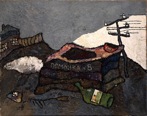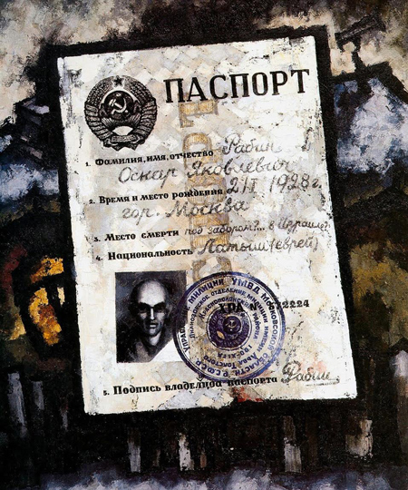 Оскар Рабин. Паспорт. 1972© Музей Майоля, Париж. Фонд Дины ВерниРанние работы Рабина очень органично вписываются в этот контекст «искусства абстрактного восприятия». Он так же, хоть и рисуя предметы, занимался абстрактной живописью особого рода — расширяя свое видение до таких объектов, которые, как селедочный хребет, помойная куча, старая газета или советский паспорт, не рассматриваются простым, интенционально направленным зрением. У его первых, написанных в 1950-е — начале 1960-х, вещей есть особая интенсивность — он утверждает свои объекты в реальности нашего взгляда, приковывая его к тому, на что мы никогда не стали бы смотреть, при этом корежа, искажая и сминая и без того жалкие формы. Советская критика назвала его «жрецом» помойки номер восемь и в этом по-своему была права. (Интересно отметить в скобках, что эта работа совпадает с обоими описаниями абстрактного опыта — на входе и выходе — еще и в том, что помимо отбросов жизни все они в каком-то виде включают в себя ее бюрократический протокол: календарь у Кандинского, полицейские бумаги у Капроу, номер помойки у Рабина, — и этот же мотив будет иметь продолжение у Кабакова.)