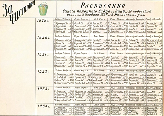 Илья Кабаков. Расписание выноса помойного ведра. 1980О начале этого поворота в России есть другой известный нарратив, а именно воспоминания Михаила Чернышова: он делил коллег на три категории — тех, кто рисовал фигуратив «с большими глазами», тех, кто не боялся просто набросить красок на холст (абстракционисты), и себя самого, который прорыл все западные журналы в Библиотеке иностранной литературы и понял, что следующим шагом в развитии искусства, если хочешь быть впереди, должен быть, напротив, уход из абстракции в конкретное. Условно говоря, его подходом вместо «апокалиптических обоев» (как Харольд Розенберг называл абстрактную живопись) стали просто обои или метлахская плитка, которую рисовал друживший с ним Рогинский. Это было совсем не глупо — но рассказ Чернышова о ходе его мысли выдает типичный подход внешнего наблюдателя, старающегося присвоить себе наблюдаемый процесс. Совсем другое — Рабин, который не пытался ни присвоить, ни встроиться ни в какую колонну, потому что он уже был там, в той колонне.