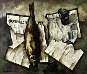 Постепенно его искусство стало конвейерным. Он без конца и хорошо рисовал ржавую селедку, лежащую на первой полосе «Правды», перекошенные бараки, разворот советского паспорта с надписью в графе «национальность» — «Латыш (еврей)» и мусорные контейнеры. Мощная и трудноусвояемая лиричность из этих картин выветривалась.
