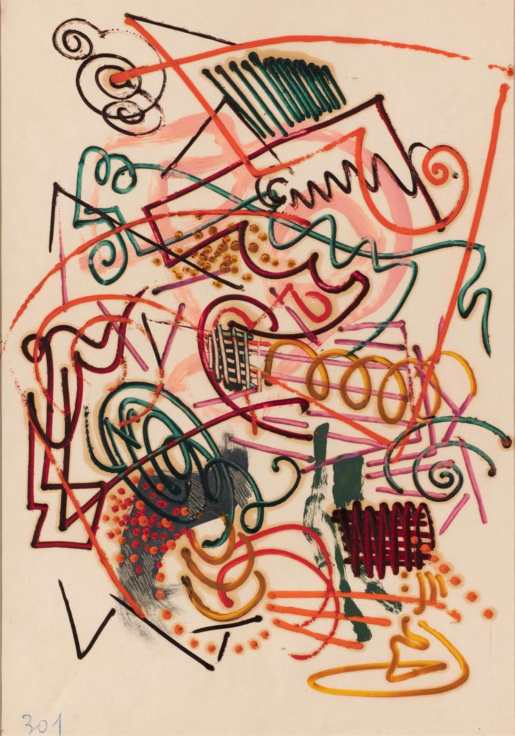 «Главное в искусстве — волновать, — писал в ранних записках Евгений Михнов-Войтенко. — Волновать новым шагом (не сюжетом) воображения». Этому принципу подчинены и его работы. Так, «№ 301» — это симфония, складывающаяся не только из линий и цветовых пятен, сколько из жестов и движений художника: Михнов-Войтенко делает упор не на готовой статичной композиции, а на процессе ее создания. Линии, зигзаги, спирали, точки и пунктиры становятся и композиционными элементами, и следами авторских жестов, которые оживают при взгляде на картину и волнуют своей спонтанностью. Как и другим представителям искусства действия — Джексону Поллоку или Аршилу Горки — Михнову-Войтенко важен не столько безупречный результат, но сам творческий акт и стремление растворить его в окружающей действительности.